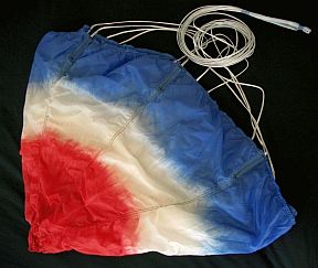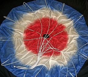 current Custom Parachute is a vibrant red, white, and blue bull’s eye